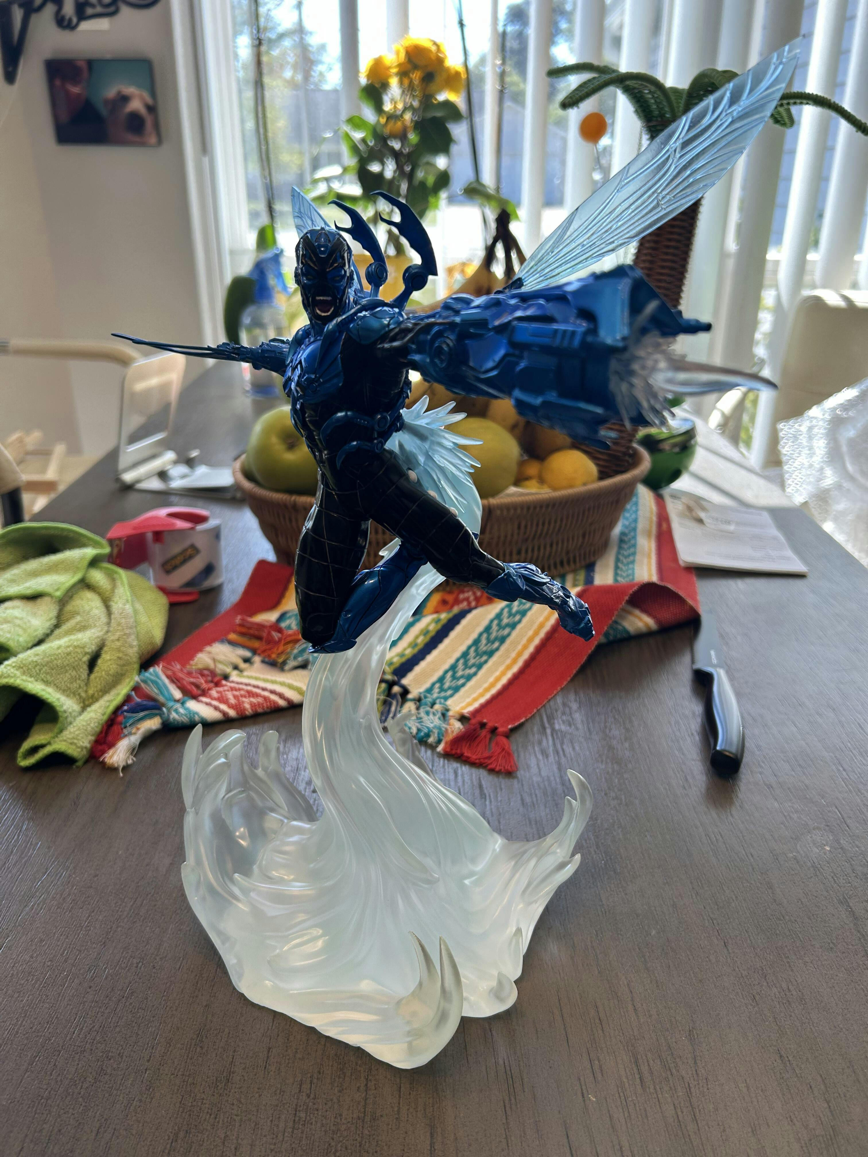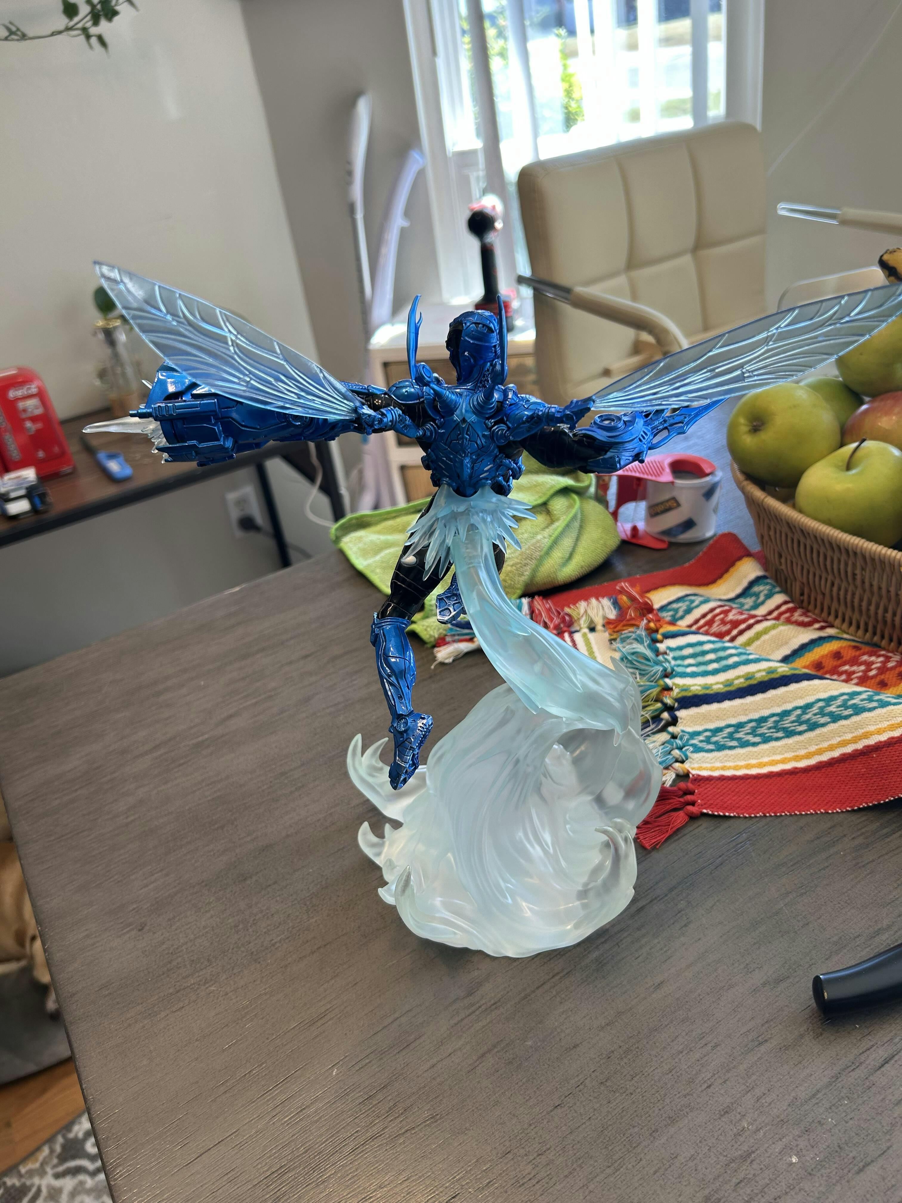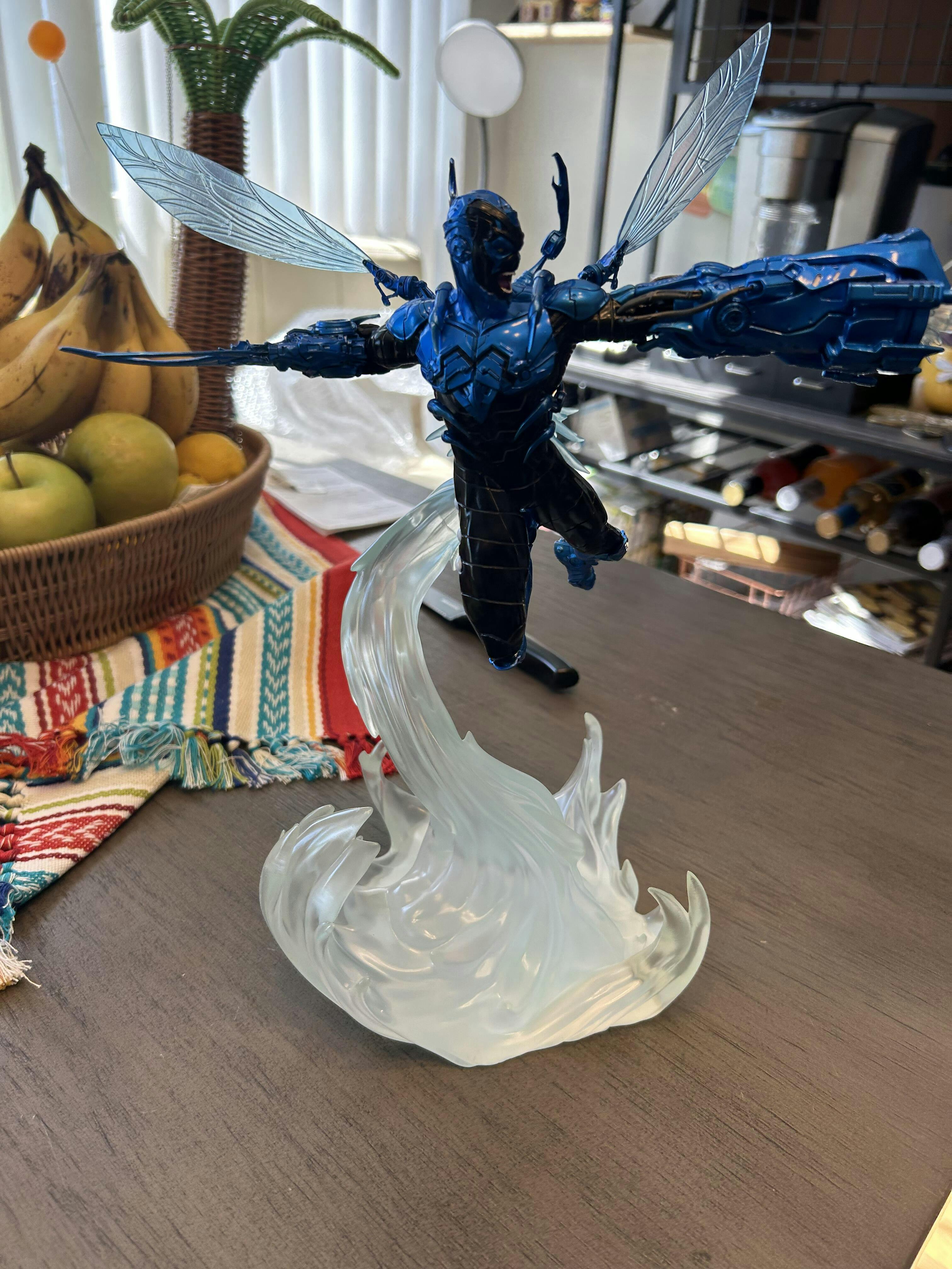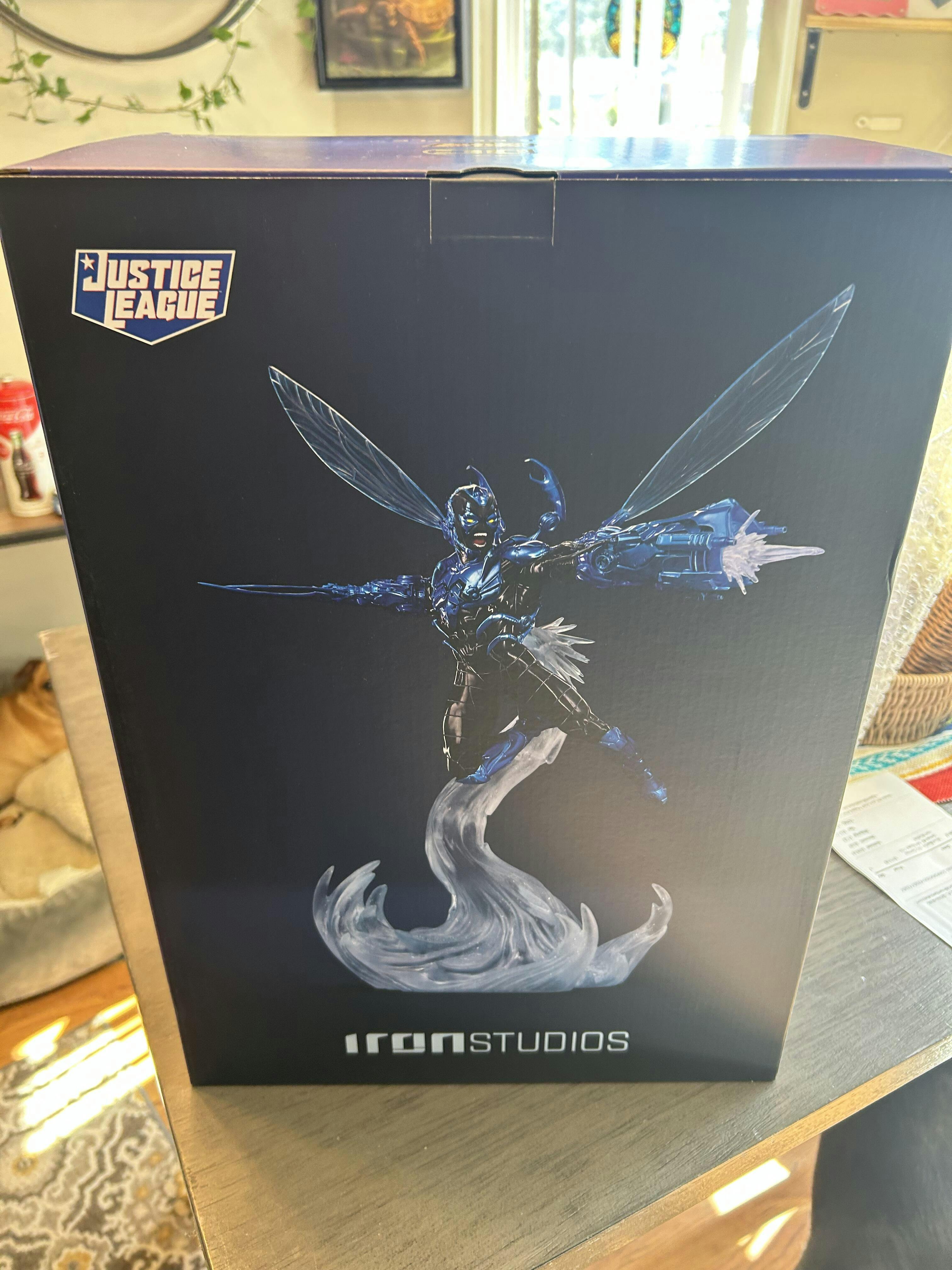 Flying in high speed, boosted by energy explosions from a jet engine on his back, the young, armored hero reaches greater maneuverability thanks to a pair of insect-like translucent wings. Wearing an extraterrestrial costume capable of reconfiguring itself to create a wide array of tools and weapons; a pair of pincers in the shape of small claws come out of his shoulders, protecting his head and back; while his right arm takes the form of big claws just like a scarab, his left arm becomes an energy blaster cannon, shooting rays against his enemies. With combat fury in his countenance, Iron Studios present the statue "Blue Beetle - DC Comics series #8 - Art Scale 1/10", with the armored hero with his blue and black armor described both as a technological artifact and a living entity.